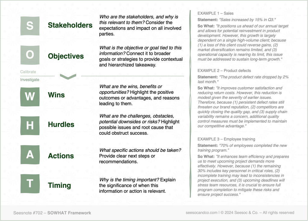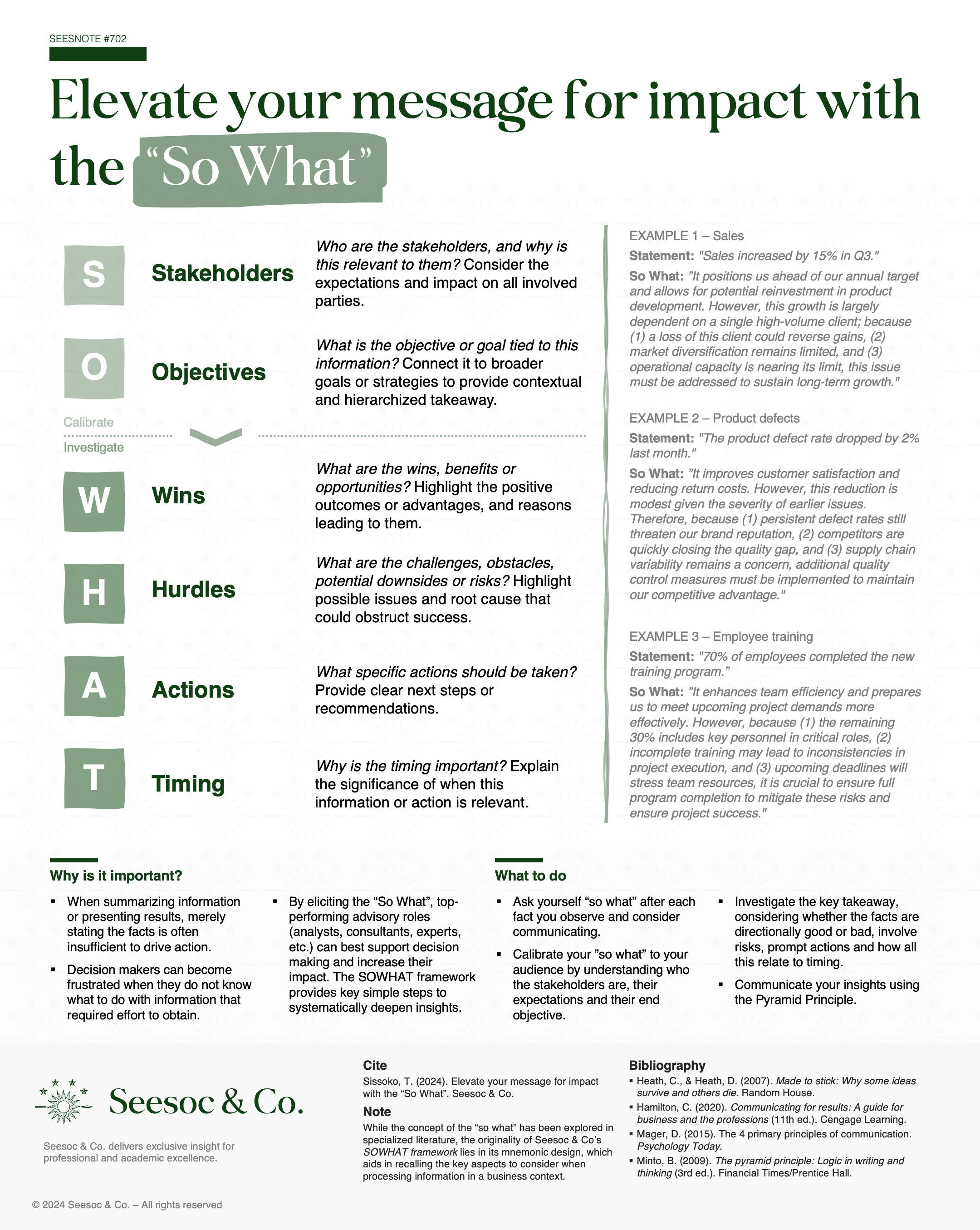While the concept of the “so what” has been explored in specialized literature, the originality of Seesoc & Co’s SOWHAT framework lies in its mnemonic design, which aids in recalling the key aspects to consider when processing information in a business context.