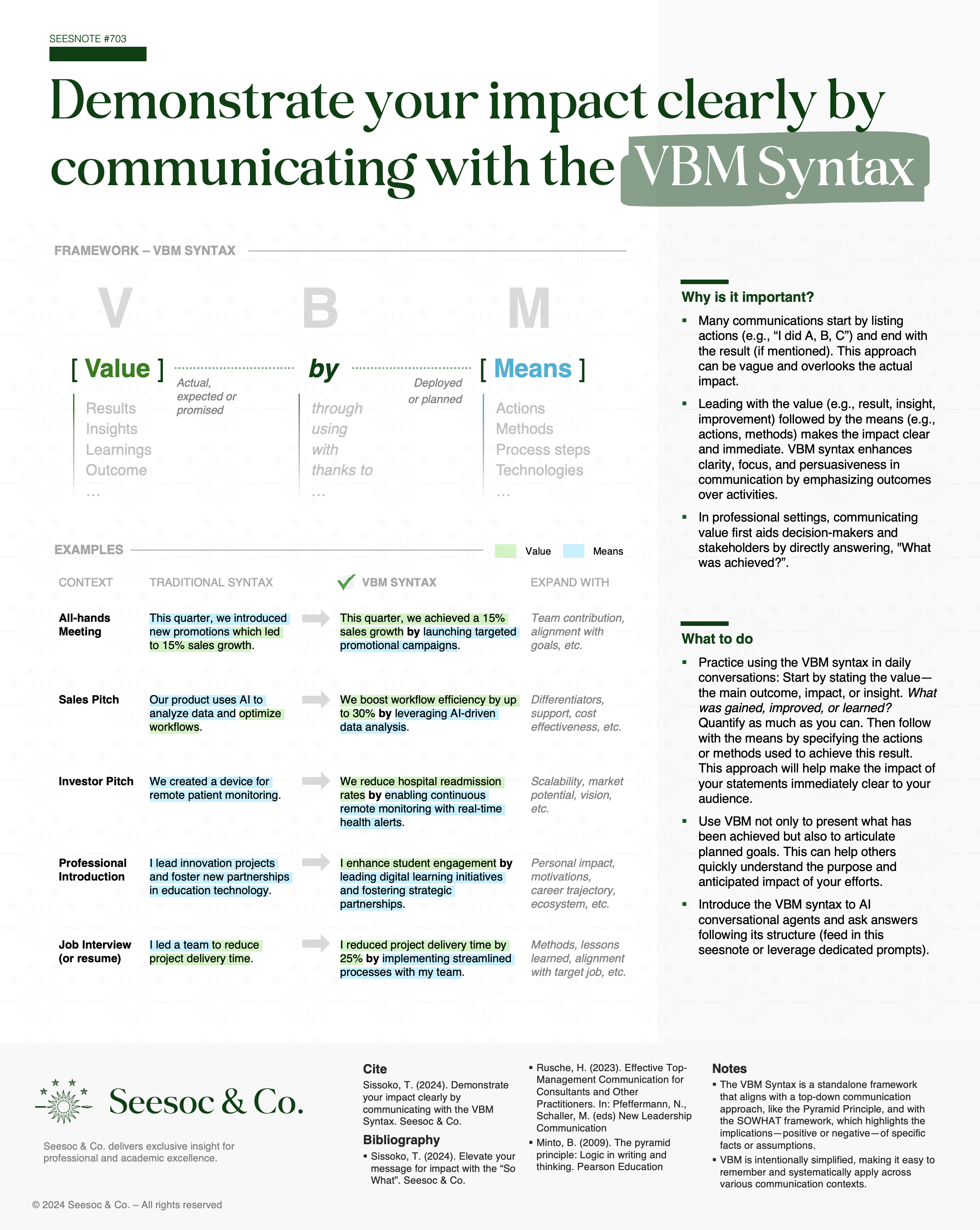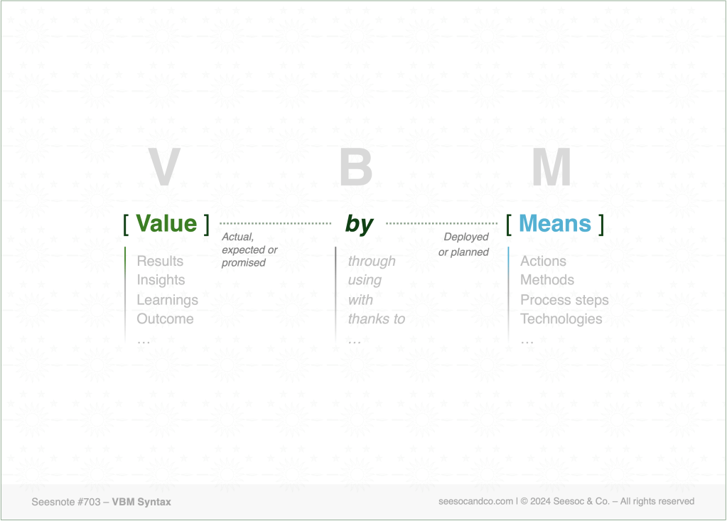 Leading with the value (e.g., result, insight, improvement) followed by the means (e.g., actions, methods) makes the impact clear and immediate. VBM syntax enhances clarity, focus, and persuasiveness in communication by emphasizing outcomes over activities.