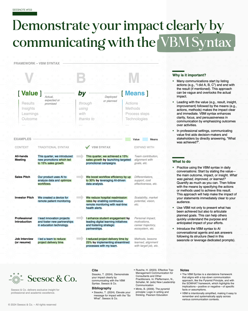 The VBM Syntax is a standalone framework that aligns with a top-down communication approach, like the Pyramid Principle, and with the SOWHAT framework, which highlights the implications —positive or negative — of specific facts or assumptions.