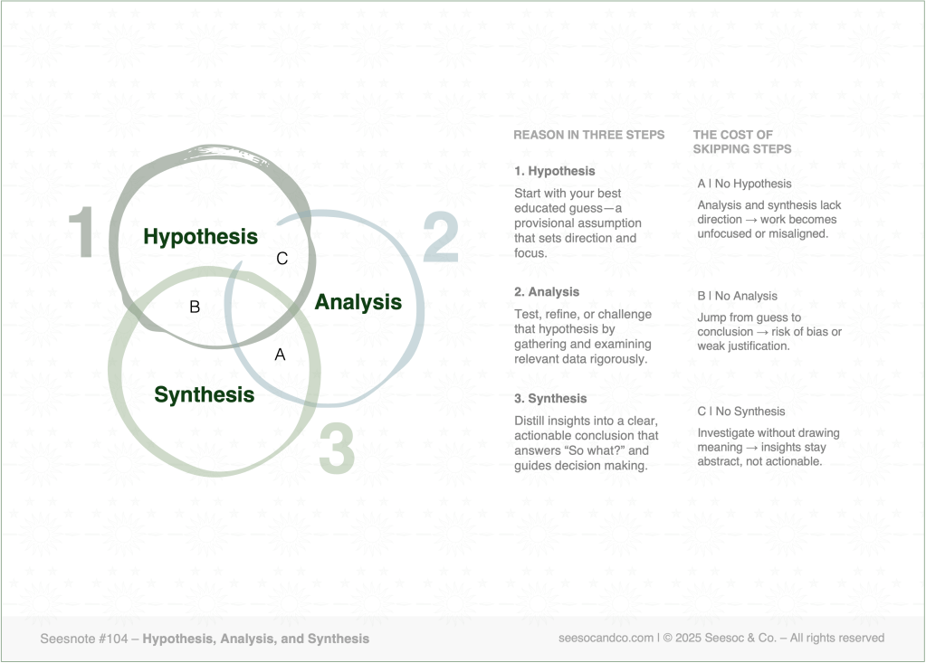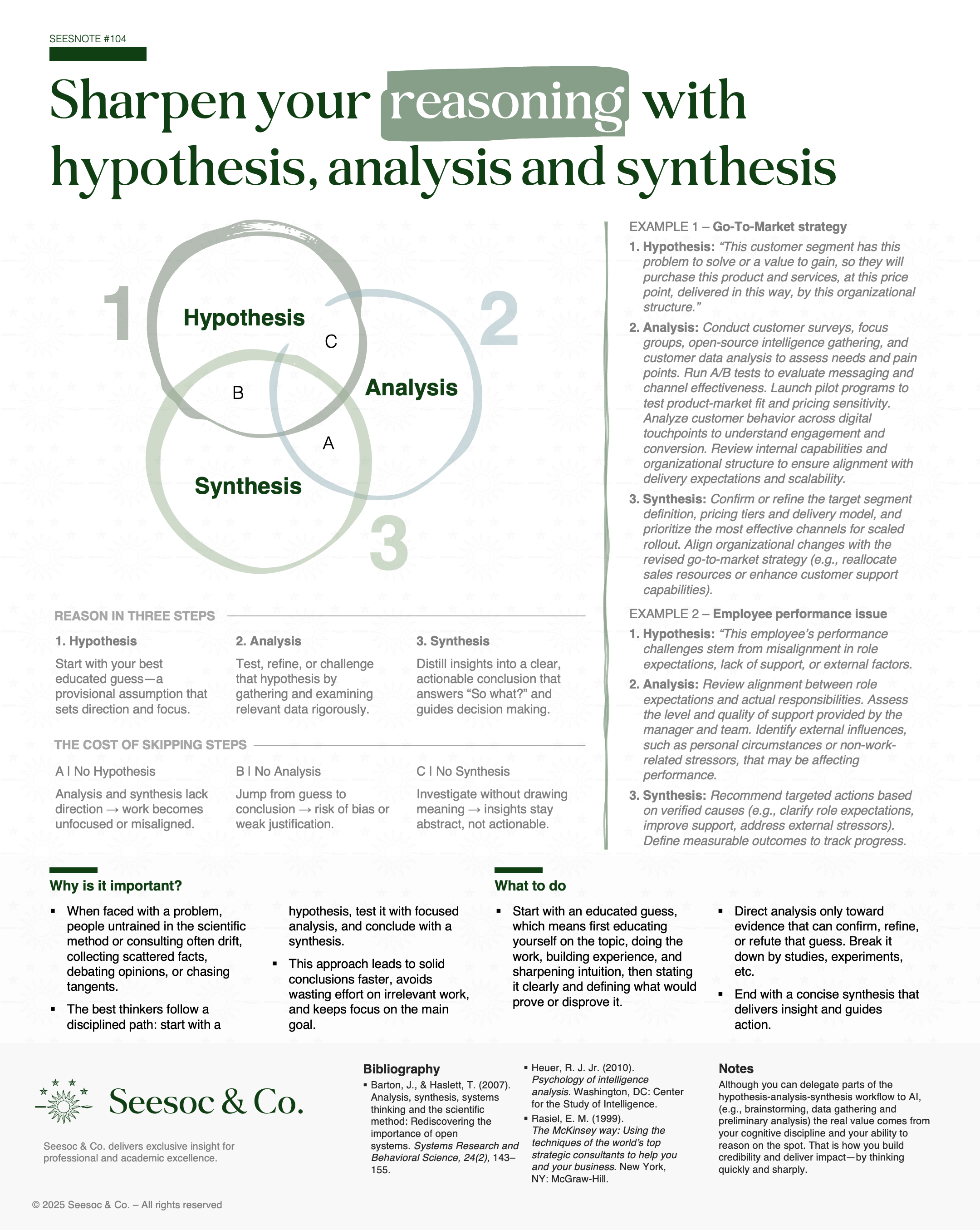 Although you can delegate parts of the hypothesis-analysis-synthesis workflow to AI, (e.g., brainstorming, data gathering and preliminary analysis) the real value comes from your cognitive discipline and your ability to reason on the spot. That is how you build credibility and deliver impact—by thinking quickly and sharply.